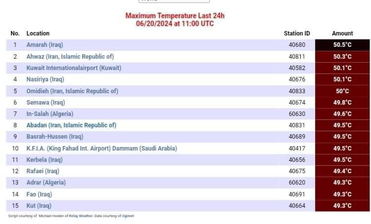 ایستگاه هواشناسی Placerville در ایالت کالیفرنیای امریکا فهرست ۱۵ شهر گرم جهان طی ۲۴ ساعت گذشته را منتشر کرد. در فهرست گرمترین شهرهای جهان، سه شهر ایران با دمای ۵۰ درجه سانتی گراد وجود دارد.